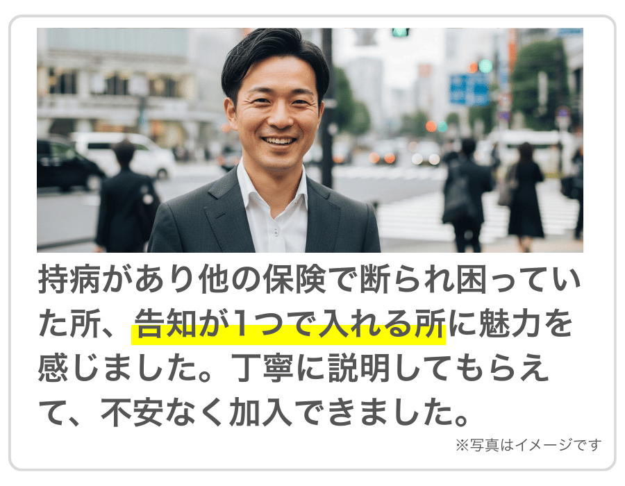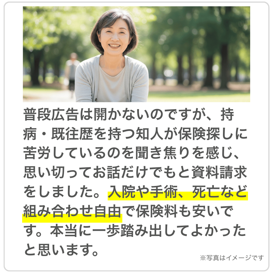 持病や既往歴があっても入りやすくて、お手頃な保険料から保障を受けられるので安心ですね!